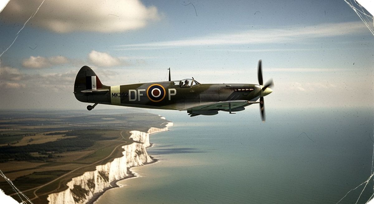 (World War Two Submarine Spitfire Mk IX:1.4), code letters “DF-P” and serial number “MK392”, (flying level above the White Cliffs of Dover:1.6), (cliffs stretching into the distance beneath the aircraft:1.5), English Channel beyond under a dramatic sky. Captured like a rare hand-colorized 1940s wartime ...