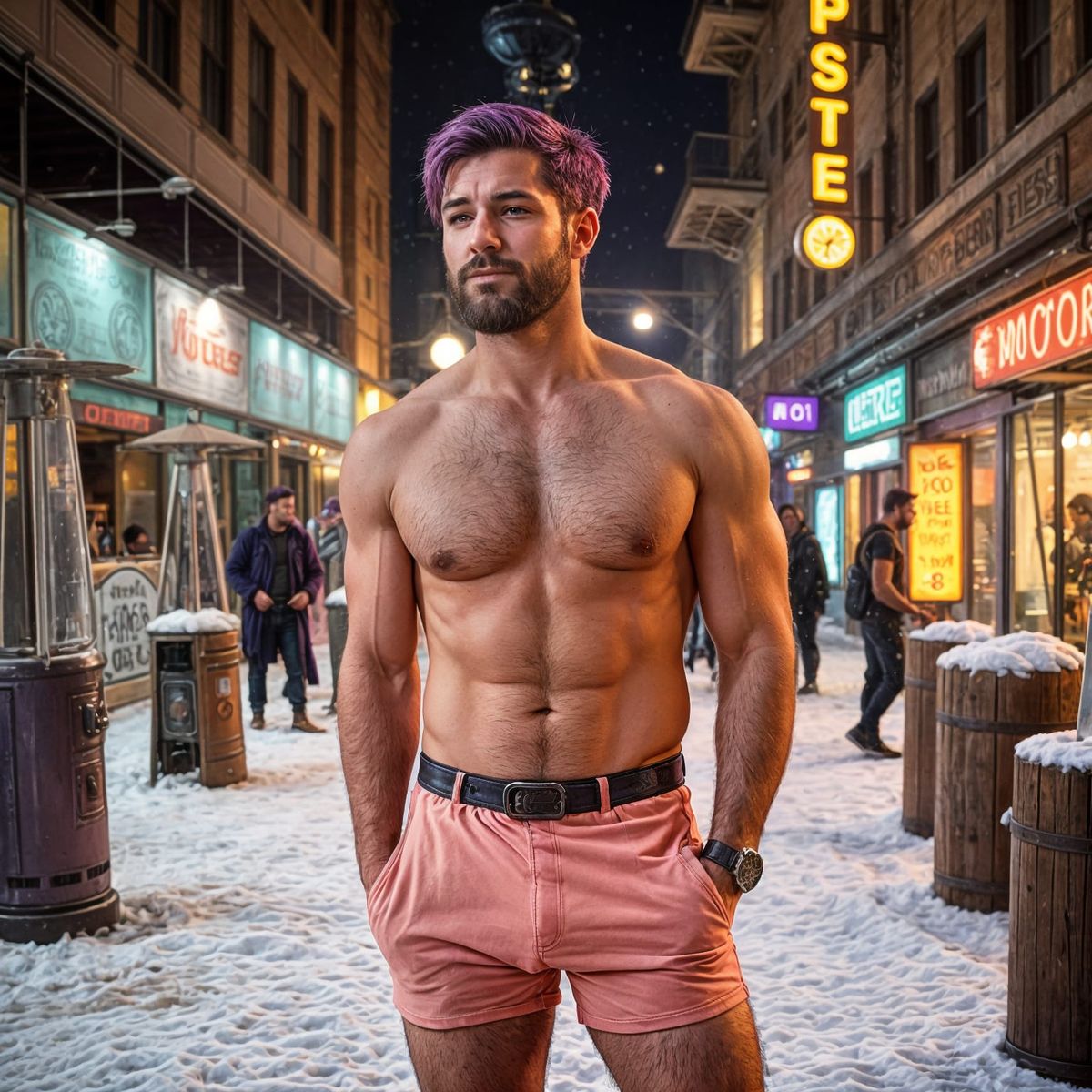This image shows a muscular man with violet hair in a tank top and boxers, taking a break in a bustling, snow-covered city square with outdoor heaters. The image is in a retro-futuristic dieselpunk style.