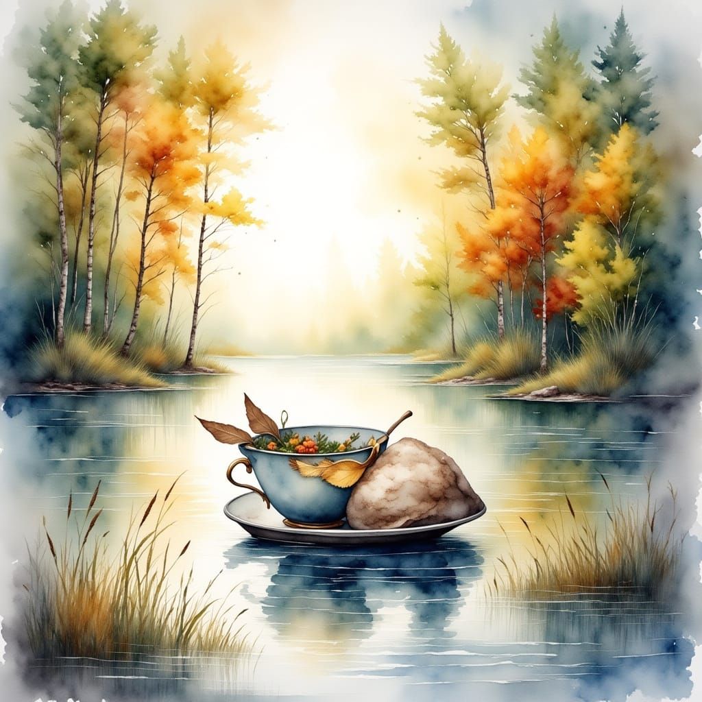 This enchanting image depicts a serene landscape of temperate forest bursting from a delicate teacup, set against a tranquil dawn shore scene, rendered in soft, beautiful watercolors.