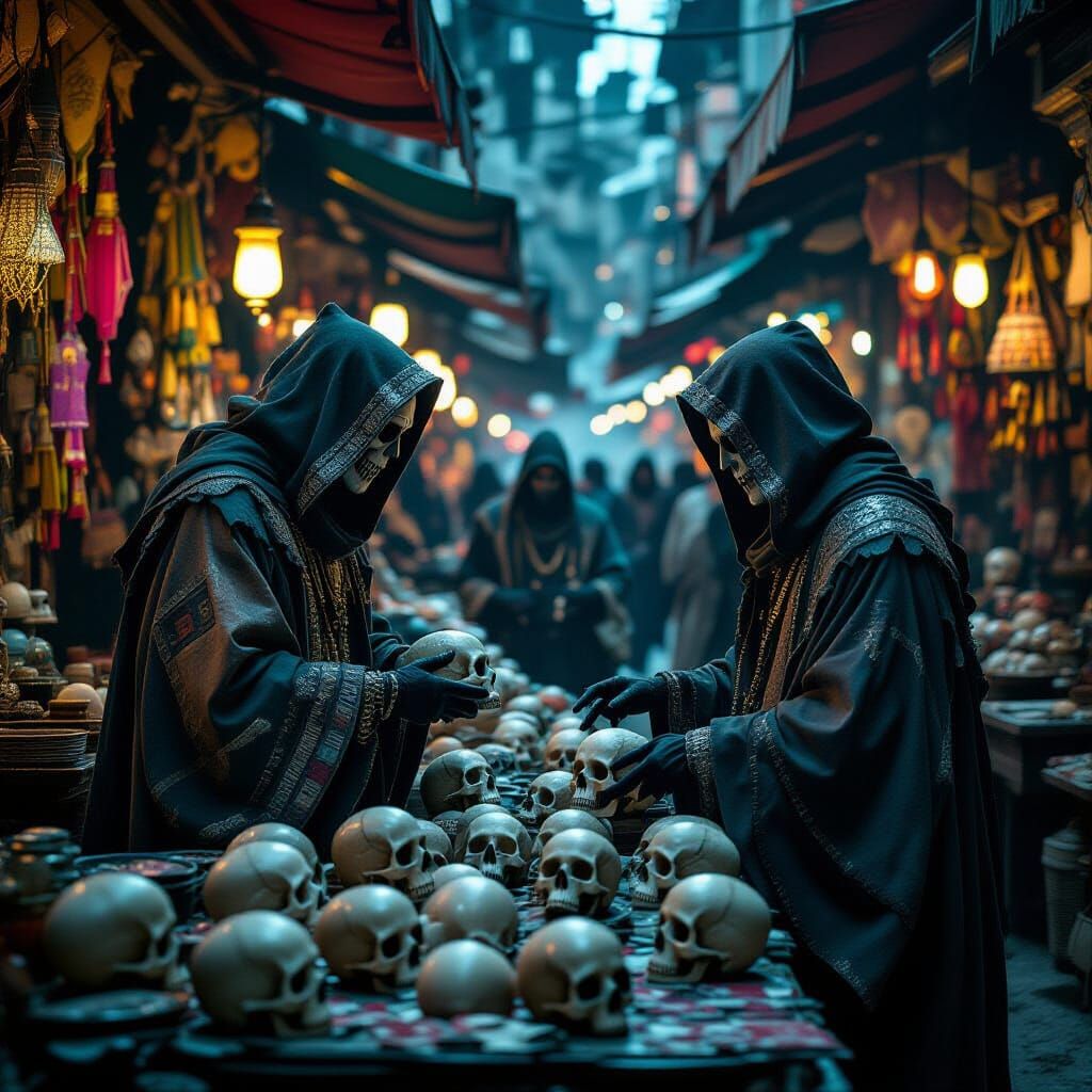 This image shows alien merchants in a vibrant night market, negotiating prices for human skulls. The scene is reminiscent of a cinematic film still, with dramatic lighting and meticulous color grading.