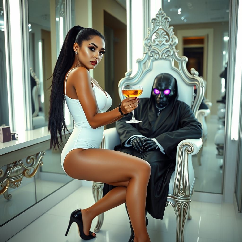 This image shows a Filipina woman in a white bodysuit and heels, posing with a biomechanical figure in a black robe. The scene is set in a mirrored, brightly lit room with a cyberpunk aesthetic.