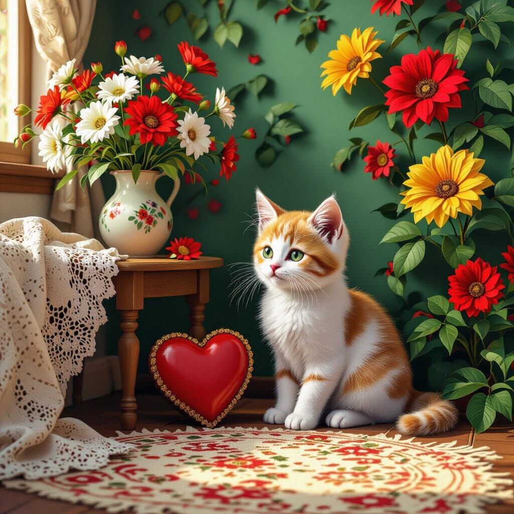 This image showcases a detailed matte painting of a white and orange kitten with bright flowers and a vase on a wooden table. It features deep colors and intricate detail in a splash screen aesthetic.
