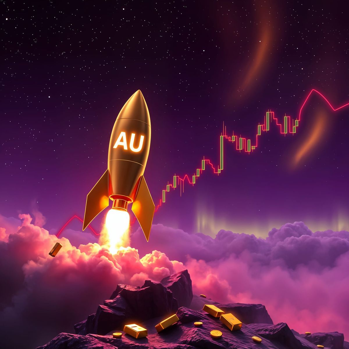 This image depicts a gleaming gold rocket with 'AU' text ascending a stock chart, surrounded by floating coins and bars against a starry night sky with northern lights. Rendered in a synthwave aesthetic.