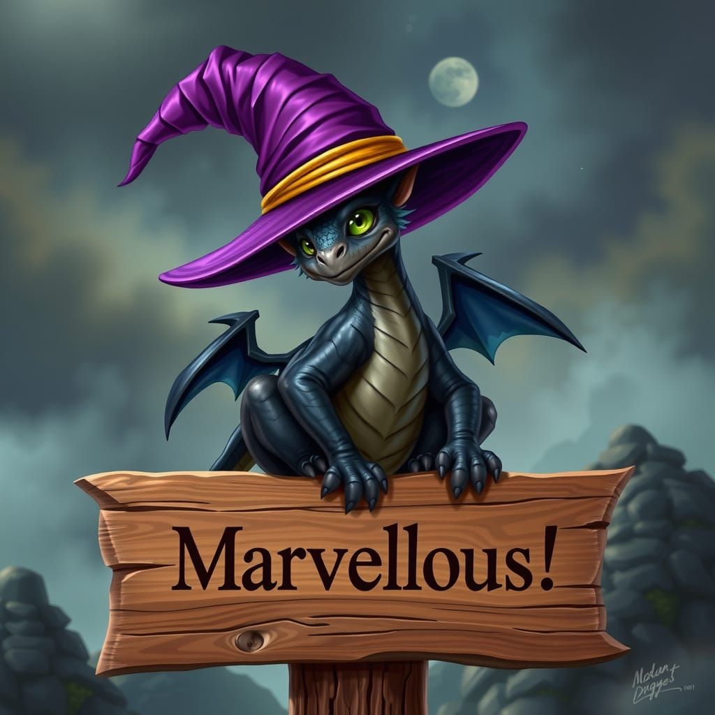 This image depicts a majestic obsidian dragon donning a grand purple witch hat, seated atop a wooden sign bearing the word 'Marvelous!' amidst a fantastical, magical environment.