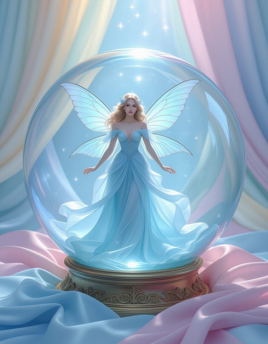 This image shows a beautiful fairy with pale blue wings and a flowing gown, enclosed within a glass globe. The scene is dreamlike with pastel jewel tones, evoking an ethereal fantasy.