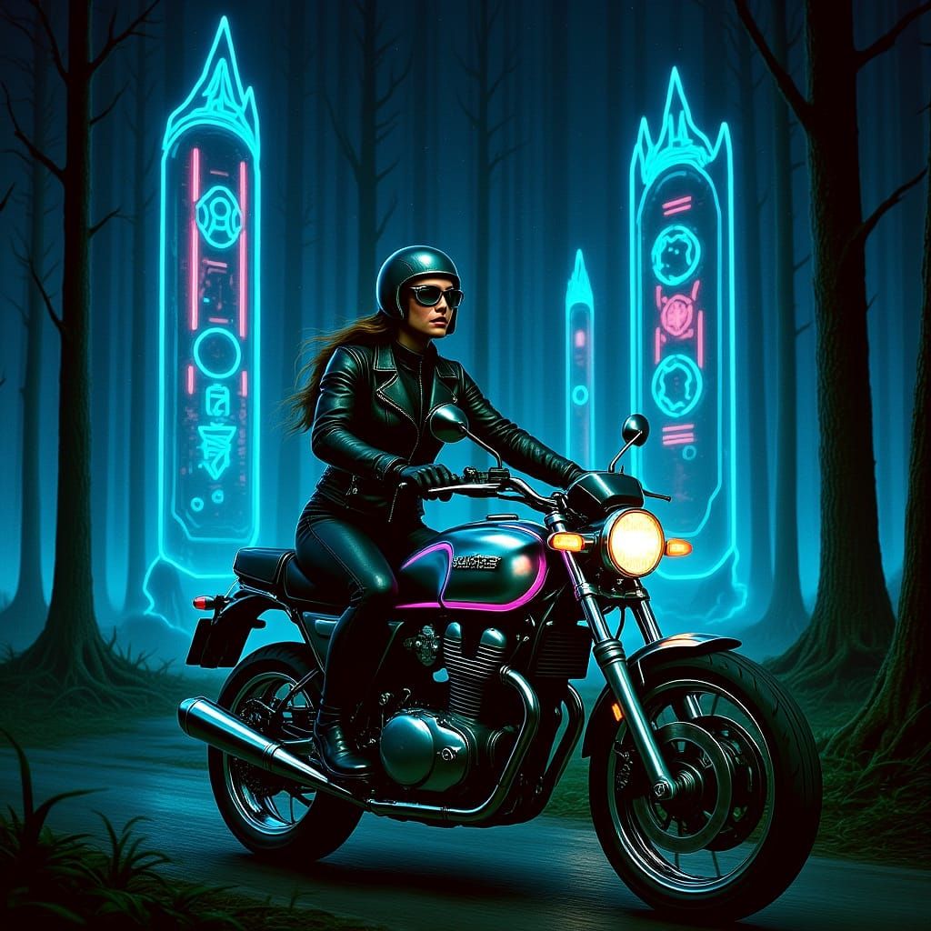 This image shows a lone motorcyclist speeding through a cyberpunk forest. The scene is filled with towering holographic displays, a custom chrome motorcycle, and gritty, vintage aesthetics.