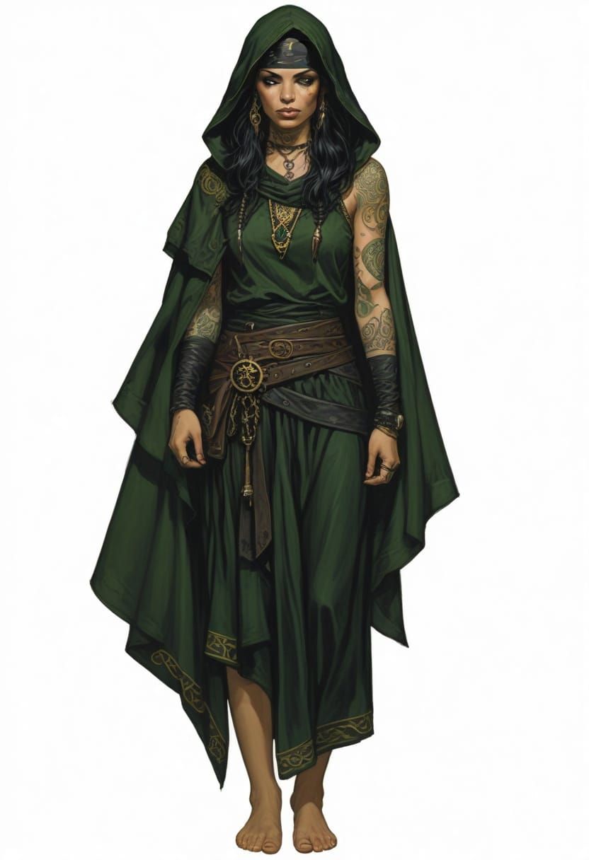 This highly detailed illustration shows a young cultist pirate with arcane sigils on her skin and dress, depicted in vivid colors with black outlining, reminiscent of fantasy art.