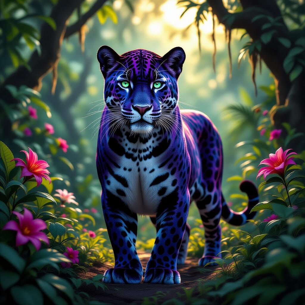 A proud, bright purple jaguar with emerald eyes stands regally in a jungle clearing. This hyperrealistic digital painting features shimmering fur, exotic flora, and dramatic golden hour lighting.
