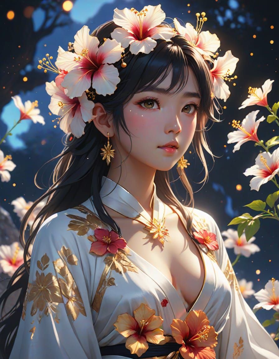 This image shows a close-up anime portrait of a celestial being. The figure is adorned with crystal hibiscus flowers and starlight eyes, rendered with soft, ethereal light and warm golden hour lighting in a vibrant digital art style.