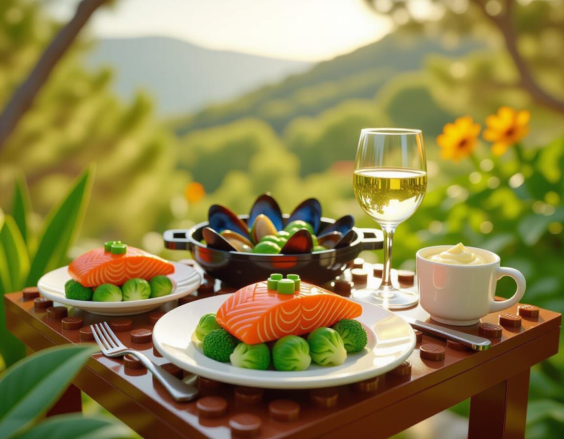 A vivid Lego meal featuring salmon and Brussels sprouts on a brown Lego table. The scene includes Lego sauce, wine, mayonnaise, and mussels, set in a lush Corsican garden, in a digital animation style.