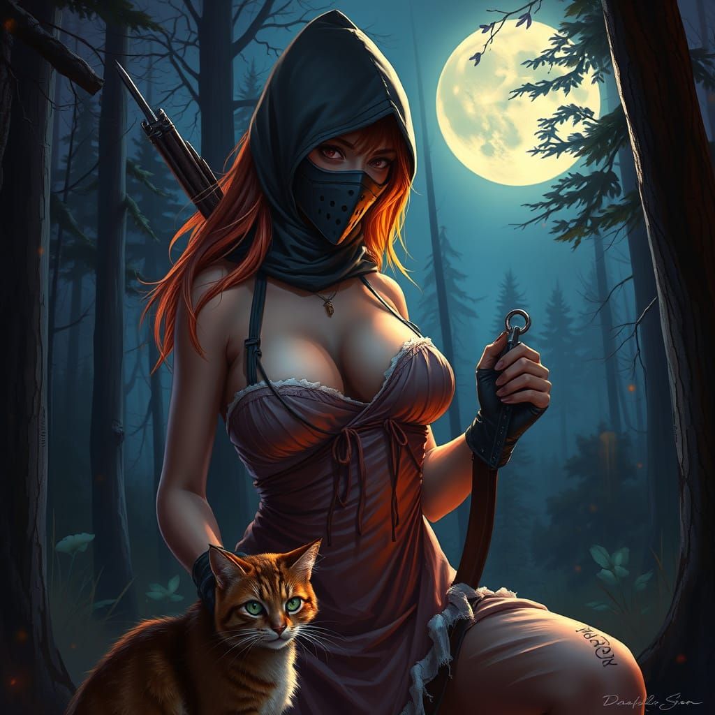 This hyperrealistic concept art depicts a masked female hunter in a torn dress with her cat in a moonlit forest. Dramatic lighting and color depth create a striking visual.