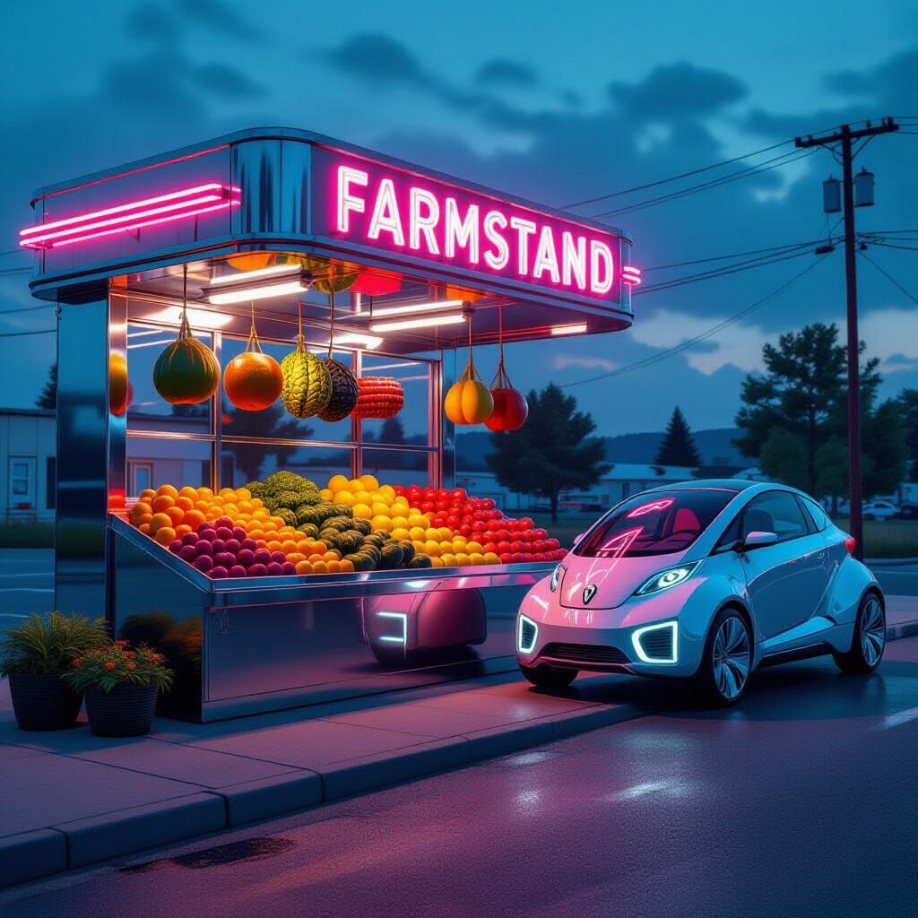 This image shows a roadside market stall in a retro-futuristic pop art style. Genetically engineered fruits and vegetables are displayed with a sleek, hovering vehicle nearby, with vibrant colors and cinematic lighting.