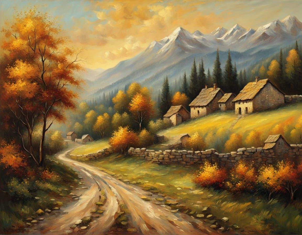 This serene oil painting depicts a tranquil Alpine village surrounded by autumn foliage, with warm golden light and soft brushstrokes evoking a peaceful ambiance.