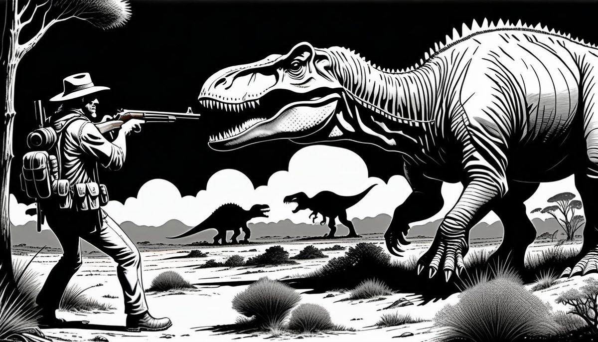 A dramatic scene of a hunter facing a Tyrannosaurus Rex, depicted in a detailed and hyper-realistic style reminiscent of classic comic art, with white ink on black paper and a focus on the hunter's determined expression and the dinosaur's powerful charge