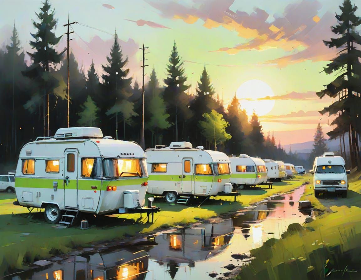A vibrant oil painting of a campsite at sunset with white camper cars and neon green stripes. The artwork uses soft brushstrokes and earthy tones in an expressive style.
