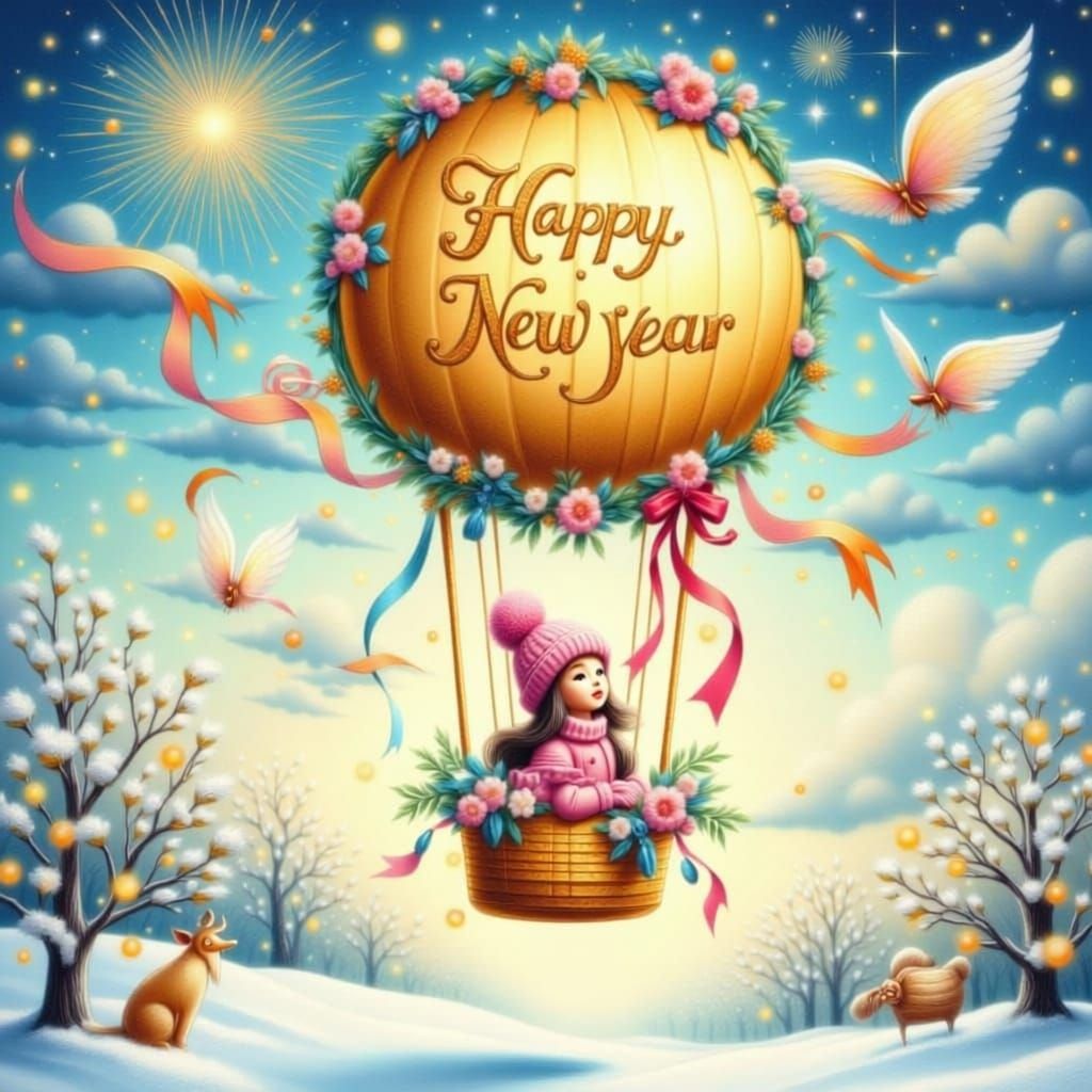 This image shows a magical illustration of a girl in a cozy winter outfit descending in a golden hot air balloon. The scene features a pastel sky, snowy landscape, and a cheerful, wondrous atmosphere with soft colors.