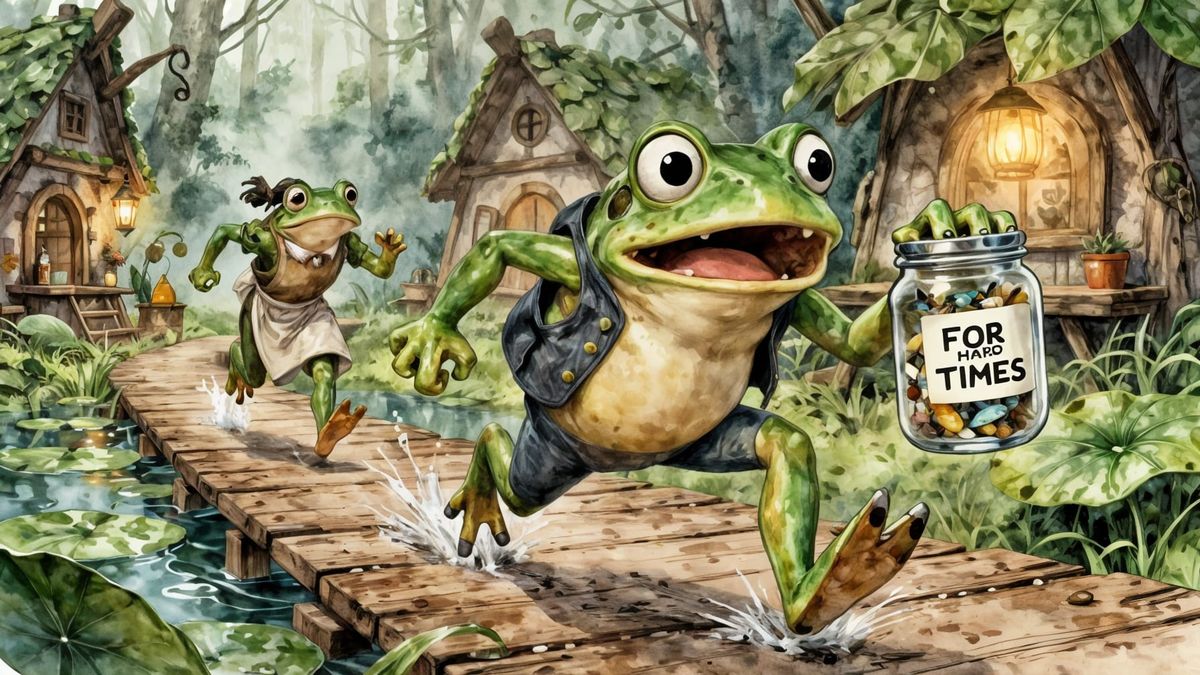A detailed watercolor illustration depicts a terrified frog man, clutching a jar of flies labeled 'FOR HARD TIMES,' sprinting from his angry wife through a fantasy frog village. Features vivid colors and a dynamic, cinematic composition.