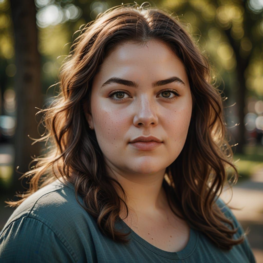 This image showcases a medium shot, photorealistic portrait of a confident, curvy woman. Soft daylight and warm tones create a natural, inviting atmosphere with a shallow depth of field.