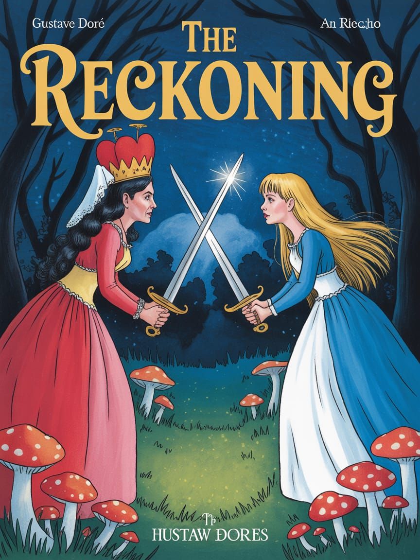 This image shows a dramatic storybook illustration of two women facing off in a dark forest. The scene evokes classic horror with a watercolor style, reminiscent of engravings.