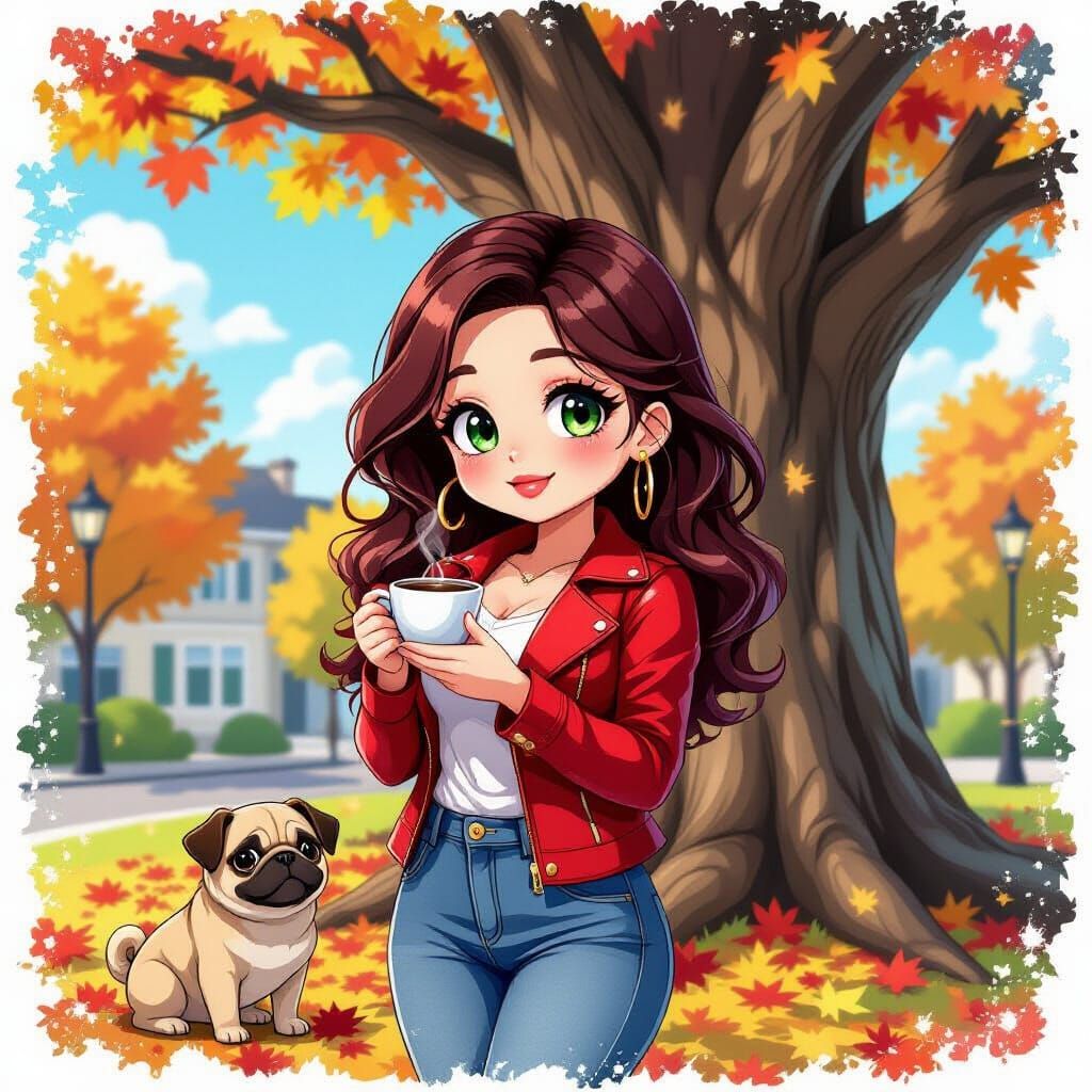 This image features a cute anime woman with crimson hair and green eyes, holding coffee near a tree with a pug. Rendered in a vibrant Autumn Anime Drawing style with graffiti and splash art elements.
