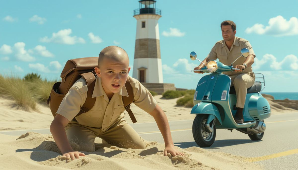 A striking image of a bald teenage boy, buried in sand with his backpack, pursuing a man on a Vespa near a lighthouse. Rendered with realistic textures and natural lighting.