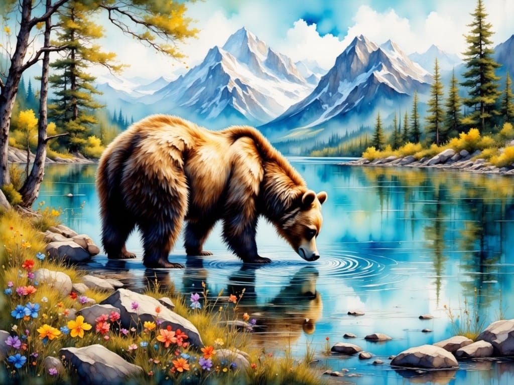 This painting depicts a majestic brown bear drinking from a serene lake, surrounded by majestic mountains, colorful wildflowers, and a vibrant blue sky. The artwork combines realism with impressionistic touches, featuring expressive brushstrokes and a naturalistic color palette.