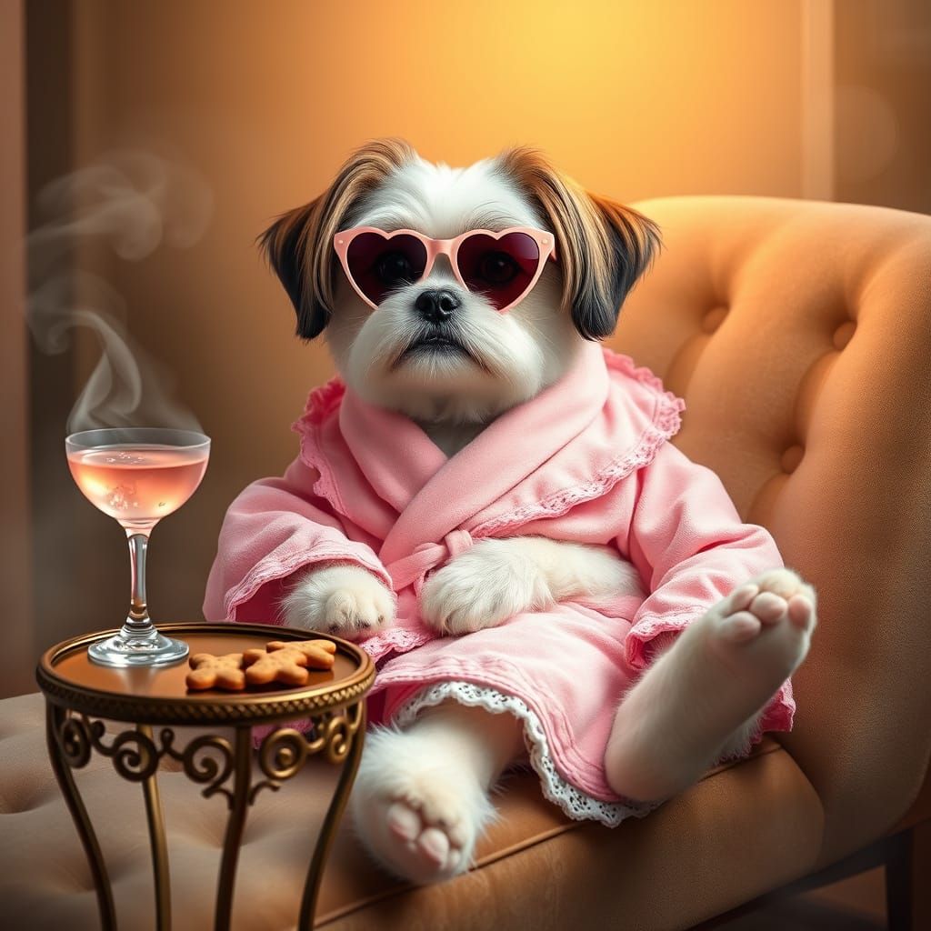 This serene image features a refined, anthropomorphic dog reclining on a velvet lounger, surrounded by delicate details and a tranquil atmosphere, reminiscent of Thomas Kinkade's warm, golden light style.