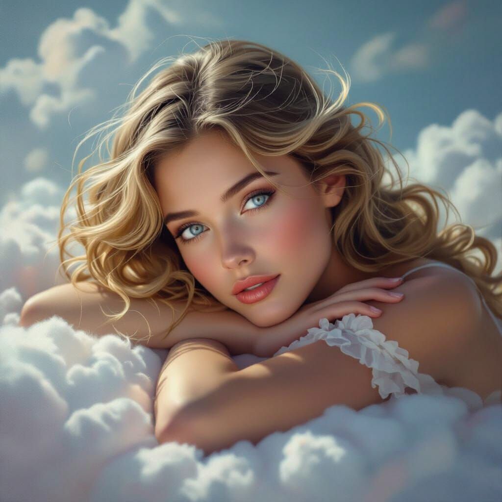This image shows a serene woman with blonde hair resting on a cloud, depicted in a soft focus, impressionistic oil painting style with a dreamlike pastel color palette.
