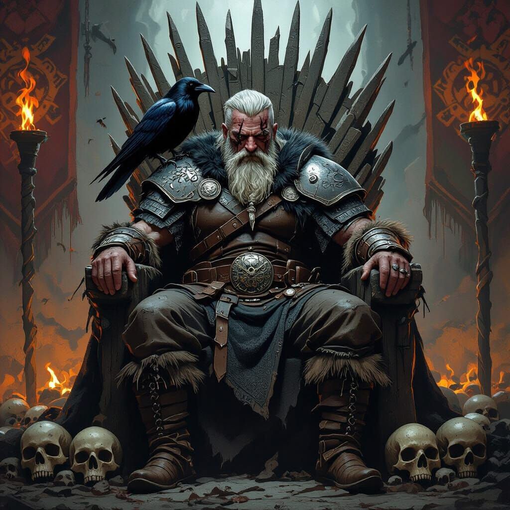 A striking picture of an old Viking warrior on a skull throne. The image is dark, gritty, and inspired by Norse mythology, with dramatic lighting and bold lines. The style is reminiscent of dark fantasy art.
