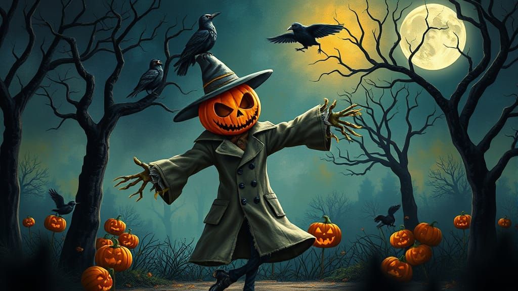 This image shows a scarecrow with a pumpkin head dancing in a forest. The 3D render is inspired by dark fantasy animation, featuring vibrant colors and intricate textures in a whimsical style.