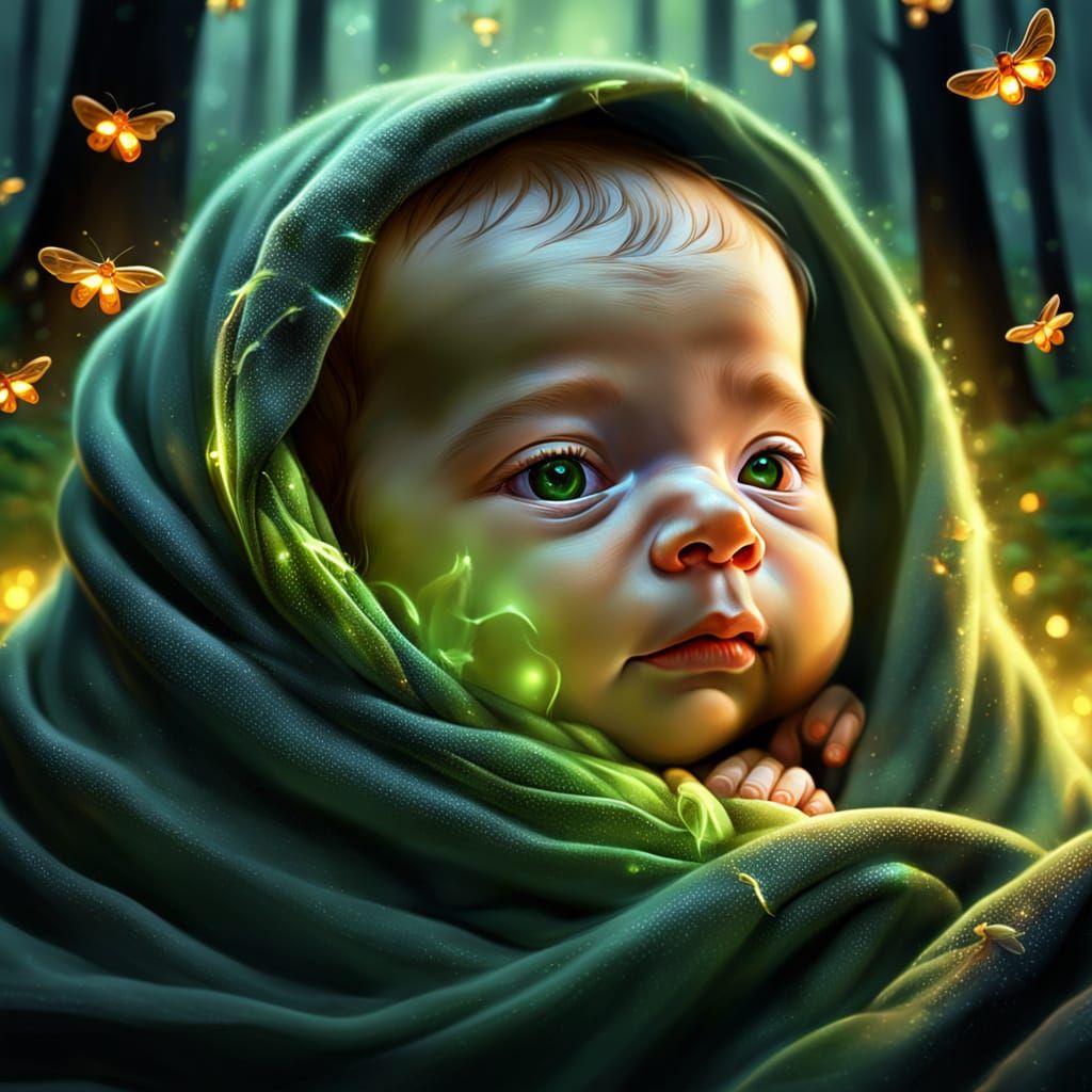 This image shows a newborn baby nestled in a blanket within a forest setting. The scene is illuminated with warm golden lighting and fireflies, rendered as vibrant digital art.