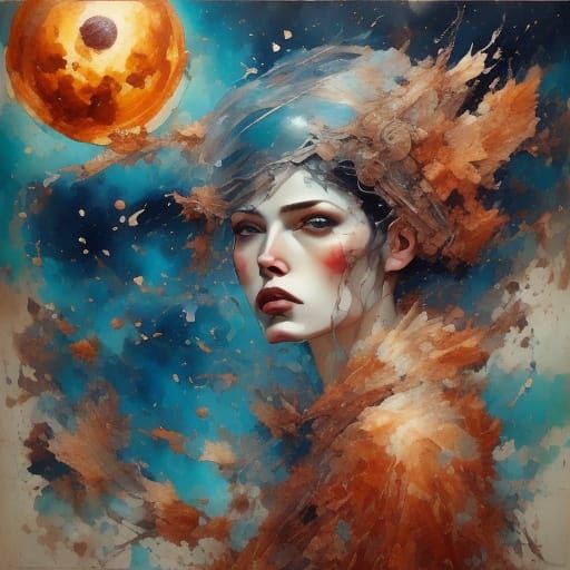 This image depicts a characterful Pisces symbol in a mixed media style, featuring rich and vibrant ocean colors. The artwork blends traditional and digital techniques to create a visually striking piece.