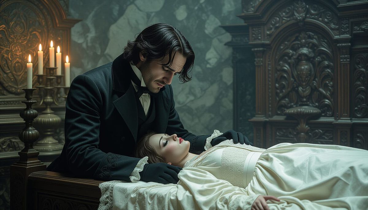 A somber figure in Victorian garb mourns over a bier in a dimly lit setting. The image evokes a haunting, mystical atmosphere as 3D rendered digital art.