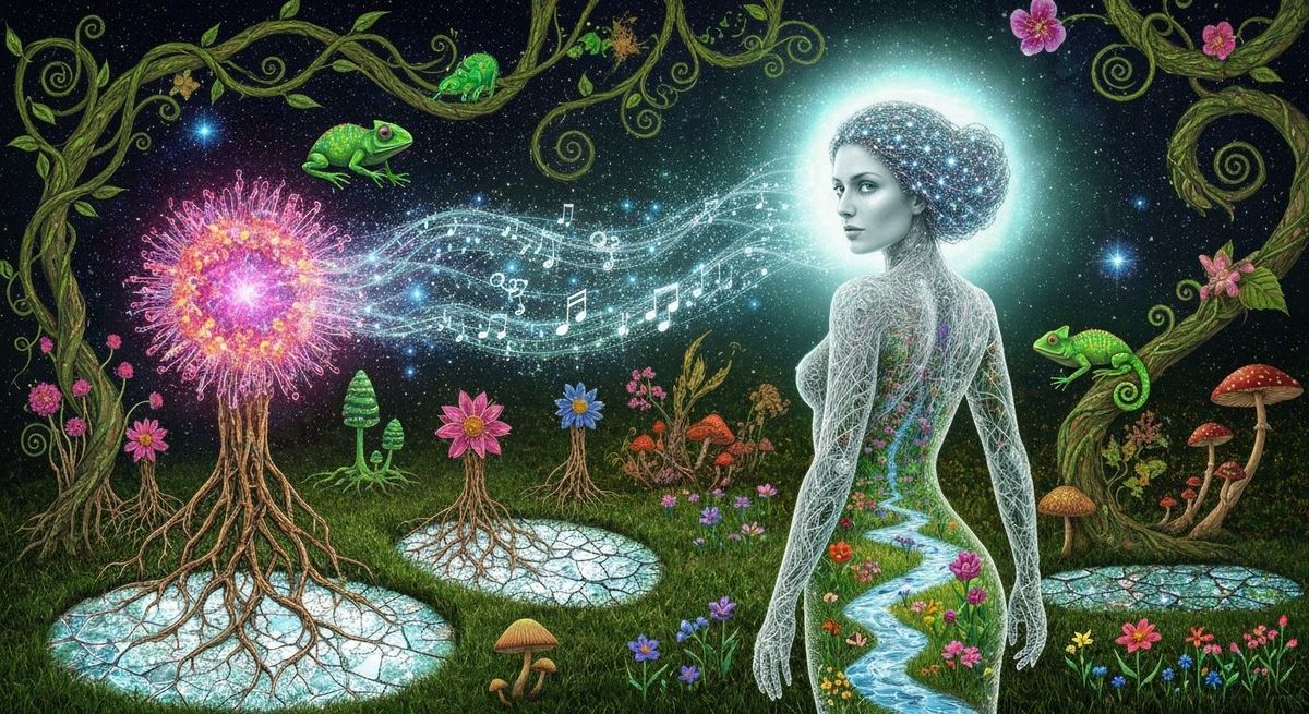A woman with stardust in her hair stands in a surreal garden, flowers blooming with cosmic energy. Her form merges with bioluminescent musical notes in a psychedelic, eco-art style.