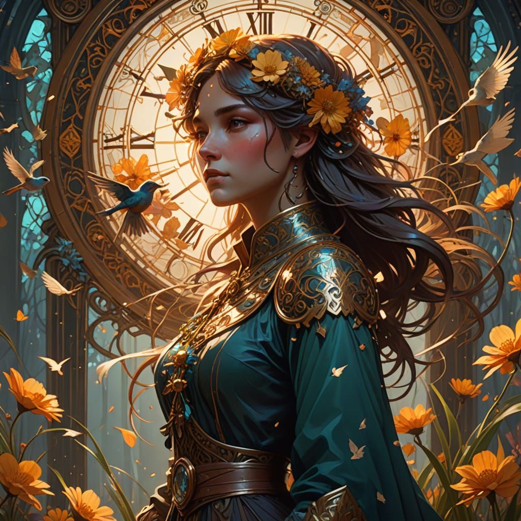 This fine art surrealist image depicts a peaceful field where time is suspended, with birds frozen mid-flight and grass unmoving. Warm golden tones and symbolic stillness evoke a sense of silent acceptance.