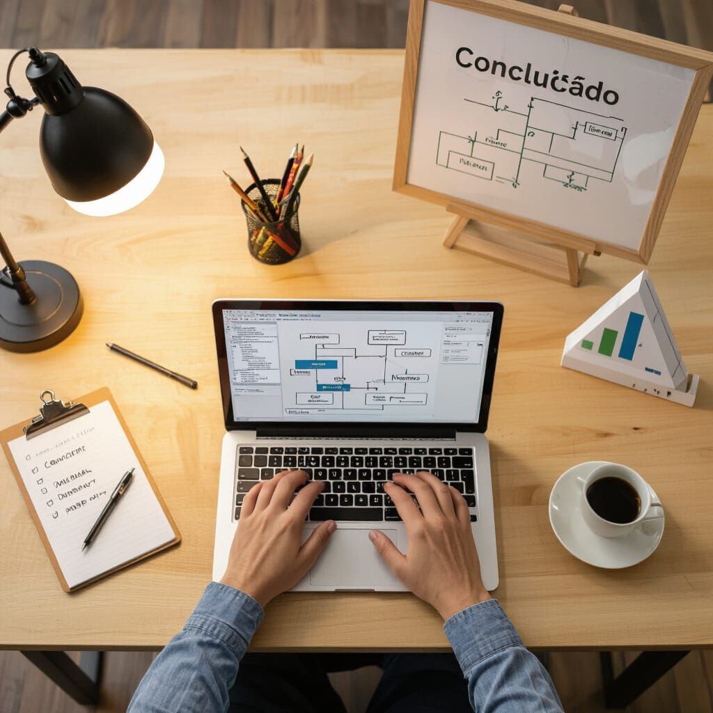 This image shows a clear sequence of project steps from an aerial view. Organized planning tools like a notepad, laptop, and whiteboard are detailed with dramatic side lighting and vibrant colors.