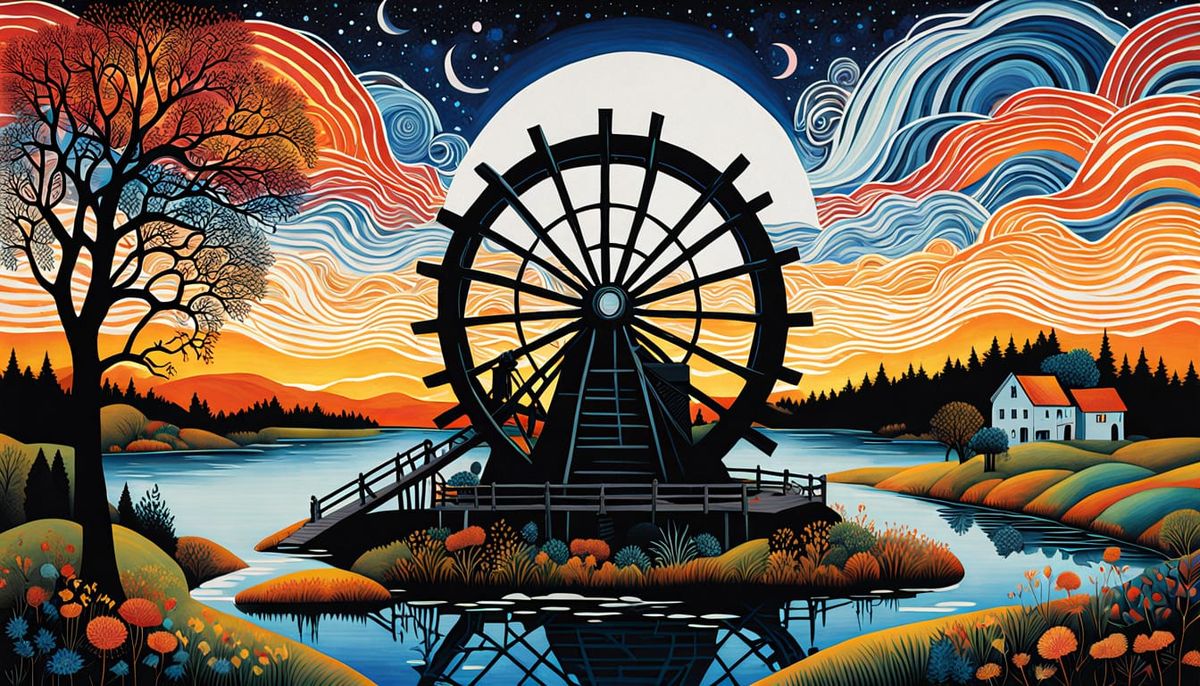 This 8K digital artwork is a mesmerizing collage of Bio Art, featuring a glowing Waterwheel from folklore and mythology, set against a breathtaking sunset. The composition is enriched by intricate water networks, serene nature scenes, and abstract designs, with thought-provoking quotes encouraging viewer...