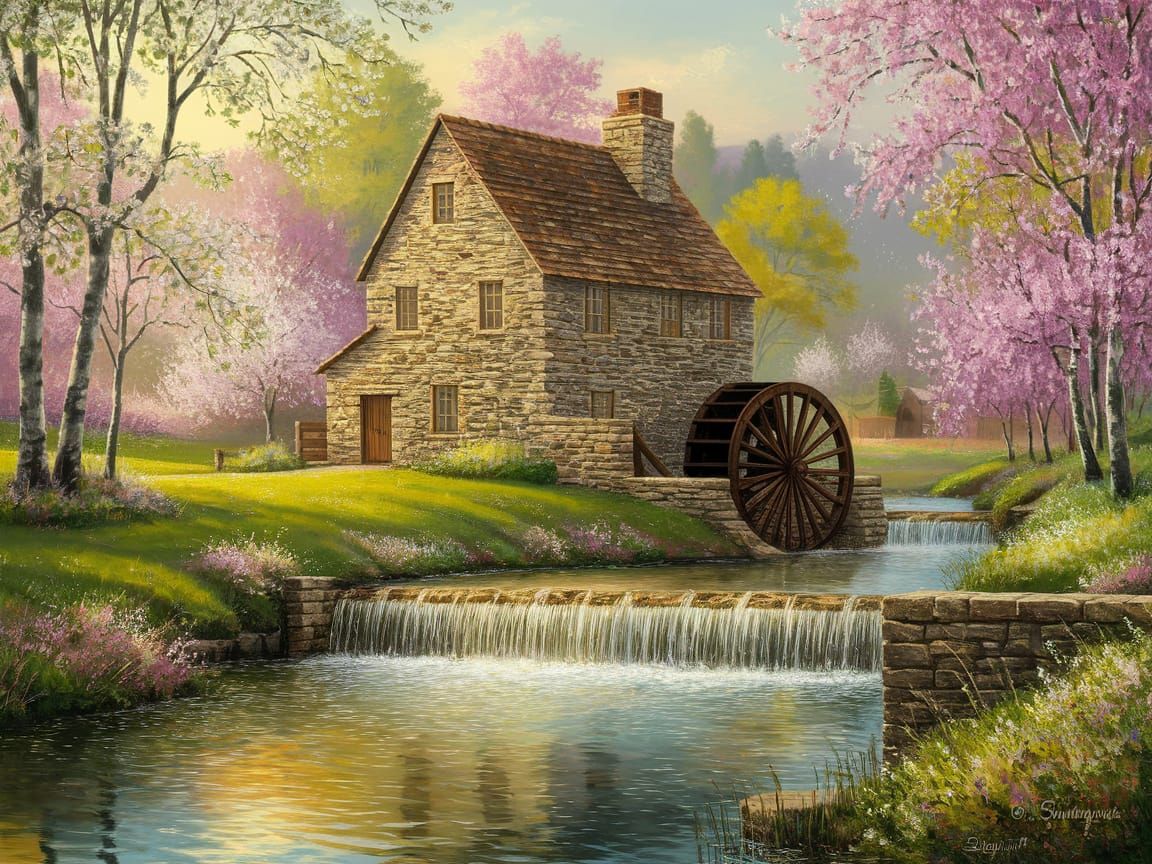 A serene oil painting of a peaceful springtime countryside scene with a rustic grist mill, water wheel, and blooming trees, evoking a sense of timeless rural charm
