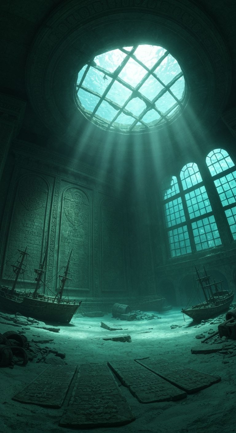 This image shows a panoramic view of a ruined underwater city. Jagged rocks and yawning portals hint at a forgotten civilization, with sunlight filtering through glass windows and illuminating ancient stone tablets in this dark abandoned seascape.