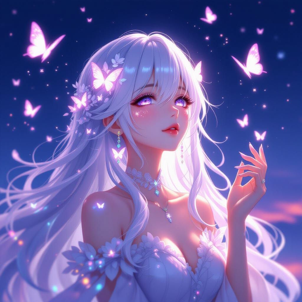 This image shows a serene anime-style woman with long, flowing white hair decorated with glowing butterflies. The cel-shaded 3D render features painterly textures and soft, refracted light in a dreamlike scene.