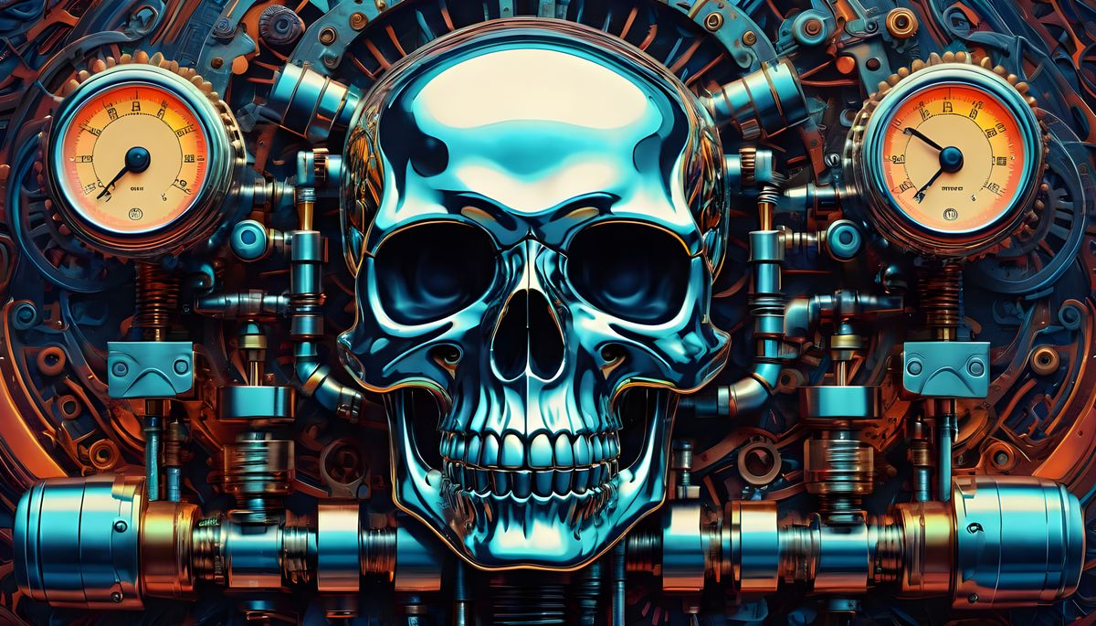 A vibrant 1960's pop art style poster features the bold text "A.I." in striking, retro colors. Inside a sleek metallic chrome steampunk skull, intricate retro-style electronic vacuum valves glow warmly, evoking a sense of nostalgia and innovation. The background is filled with soft, swirling patterns ...