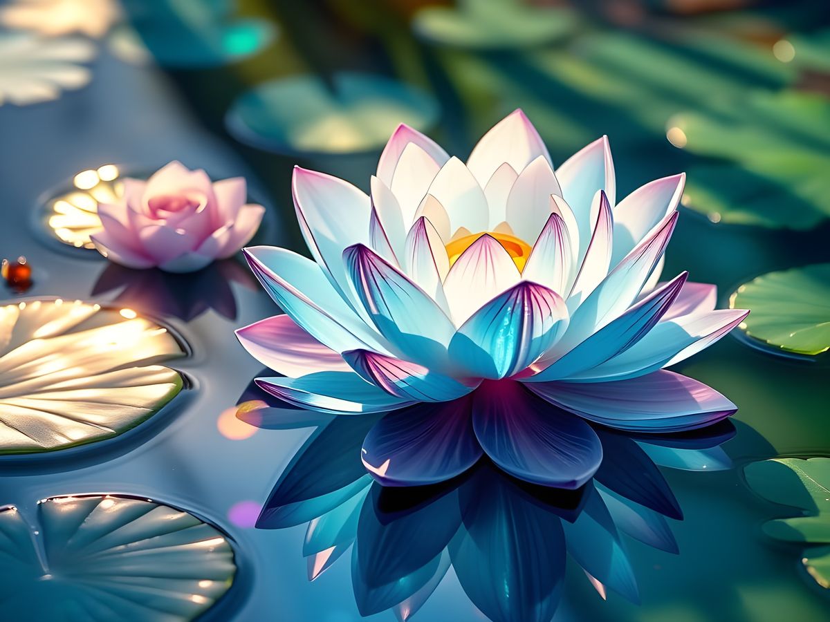 This stunning image depicts a lotus flower in a serene pond, surrounded by a kaleidoscope of colors in a dreamlike glass fantasy. The delicate petals of the flower shimmer in a gradient of blue, turquoise, and purple hues, evoking a sense of airiness and ethereal beauty.