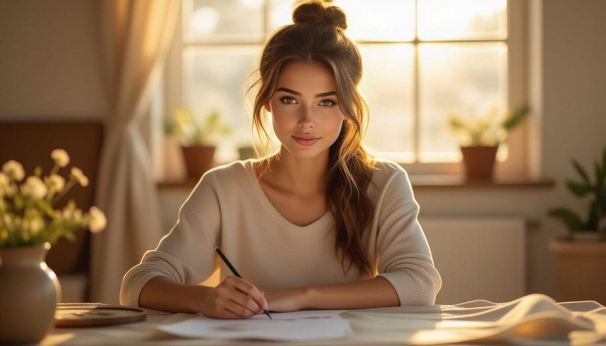 A stunning photorealistic portrait capturing a woman's natural beauty and serene focus as she engages in her craft. Golden hour lighting creates a warm, soft glow, emphasizing subtle textures with cinematic depth.