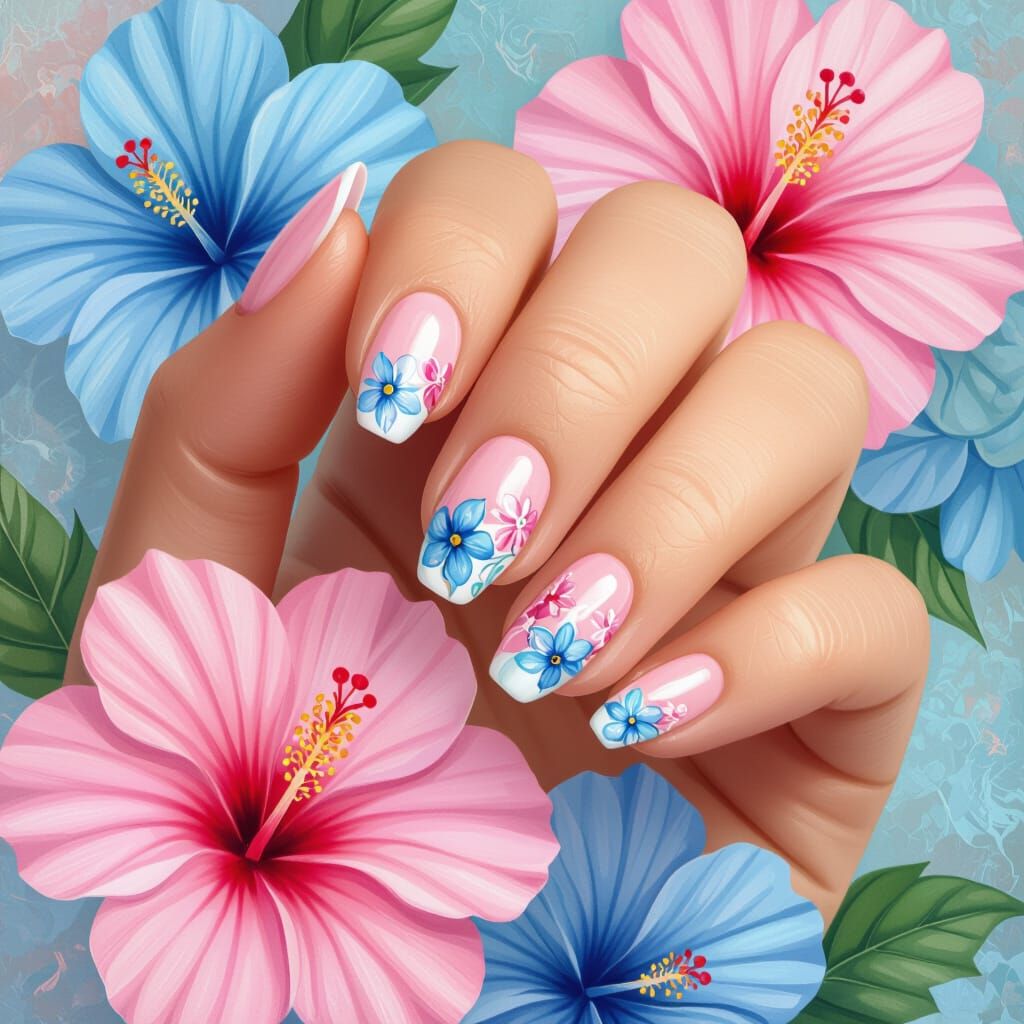 This image features delicate fingers with a French tip nail design decorated with pink and blue hibiscus flowers. The aesthetic is whimsical, with soft textures and vibrant colors.