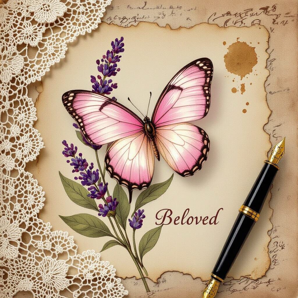 This image shows a magnolia with a butterfly on vintage newsprint. The artwork is reminiscent of art nouveau and incorporates delicate lace, a fountain pen, and a cursive 'Beloved' inscription.