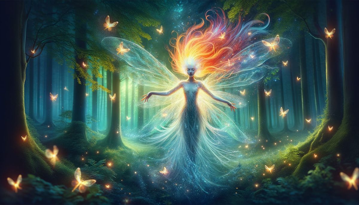 A striking picture of a forest nymph in her natural habitat. Surrounded by fireflies, the goddess of the forest exudes an ethereal beauty, her red hair flowing in the breeze. The image is rendered as digital art.