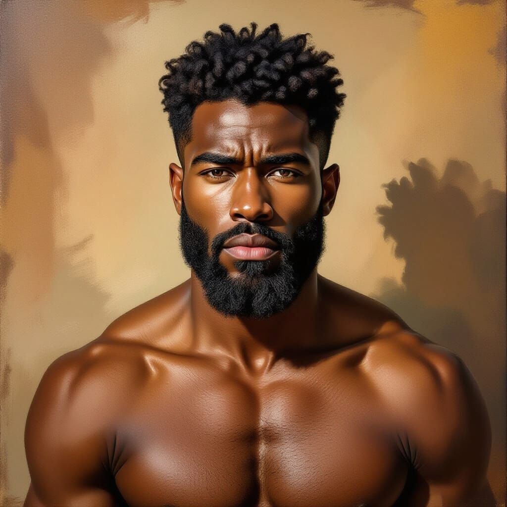 This image shows a solemn Black man with a beard, bare-chested, in a classical oil painting style. Rich lighting highlights his muscular chest and textured skin against an abstract background.