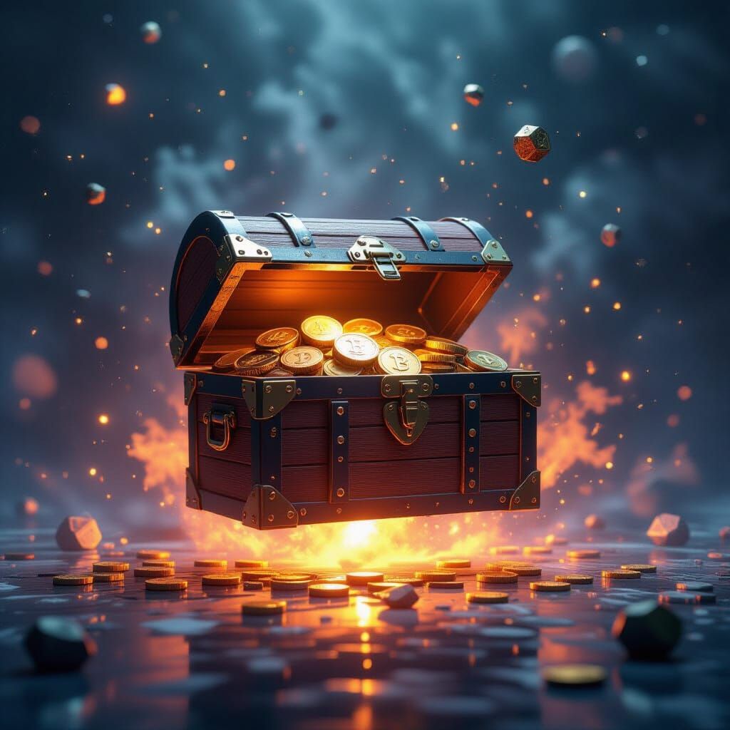A striking picture of a treasure chest overflowing with cryptocurrency, floating in space. The image is rendered in a hyperrealistic style with vibrant colors and advanced sci-fi textures.