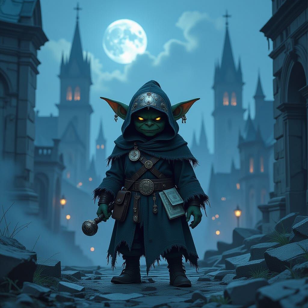 This image depicts a lone goblin in decaying gothic city. The scene features imposing architecture, ominous shadows, and ethereal moonlight, rendered in a dark fantasy digital painting style with hyperrealistic textures.