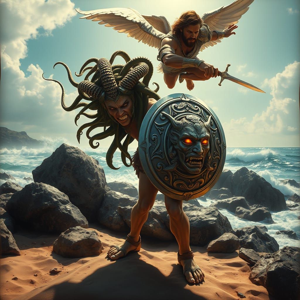 This image depicts Medusa, the Gorgon, locked in a fierce battle with Perseus, set against a rugged coastal backdrop. The scene is characterized by dramatic lighting and intense emotions, blending the styles of Caravaggio and H.R. Giger, with meticulous attention to detail reminiscent of Zdzisław Beksińs...